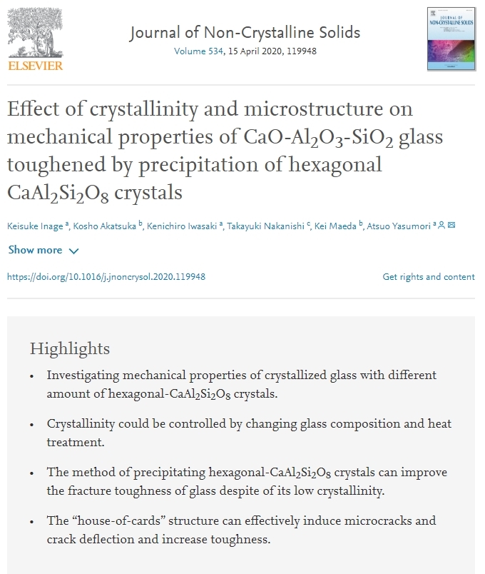 ガラス中にCaAl2Si2O8板状結晶のカードハウス構造を形成することで、マイクロクラックの誘起や亀裂の偏向が破壊靭性の向上に繋がることを明らかにしました。