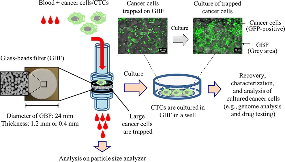 当研究室で作製したガラスビーズフィルターを用いることで血中のガン細胞を選択的に捕捉することができました。