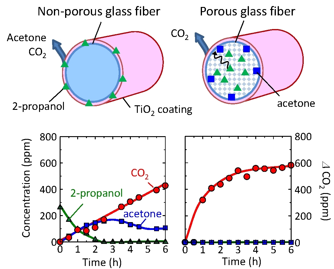 多孔質ガラスファイバークロスと光触媒を組み合わせることで、分解時の中間生成物を大気に放出することなく有害ガスを無害化できることがわかりました。