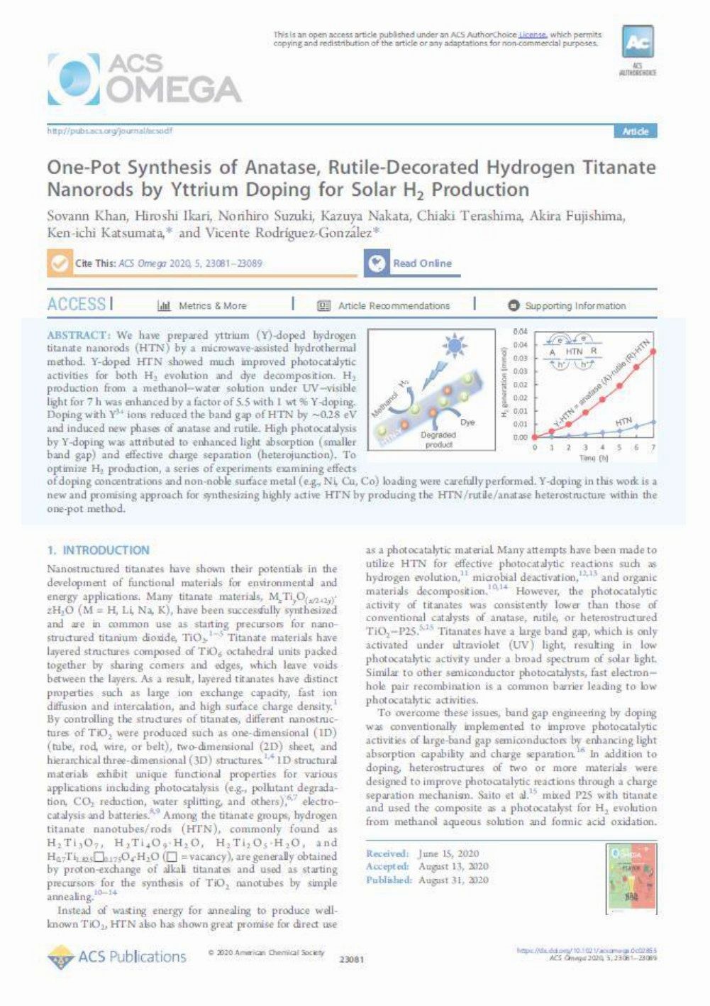 JSPS外国人特別研究員のKhan氏の研究成果、溶液法によりイットリウムをドープしたアナターゼとルチル混合のナノチューブを合成し、水を分解して水素を生成できることを示しました。