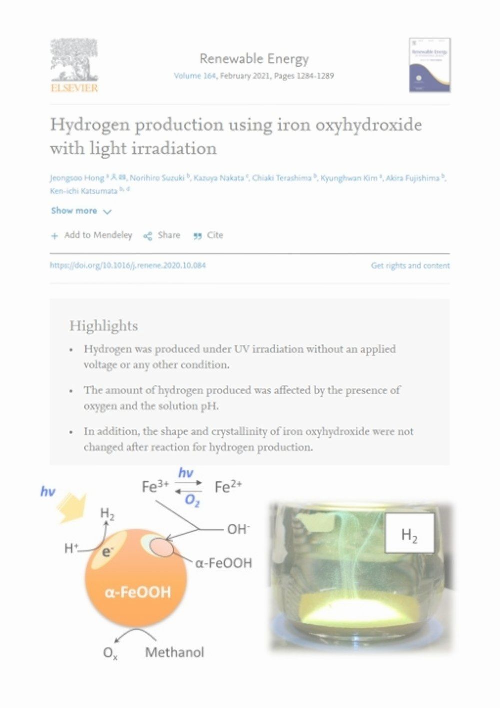 韓国のGachon大学のHong先生と勝又先生の共同研究成果、オキシ水酸化鉄がメタノール水溶液から光水素生成する現象の反応機構について調査した内容です。