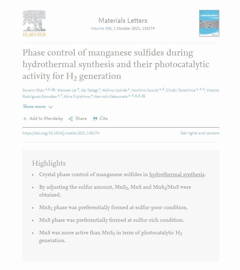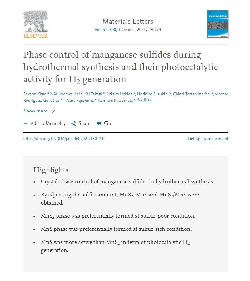 JSPS外国人特別研究員Khan氏の研究成果、水熱合成法により硫化マンガンの結晶相を制御し、MnSがMnS2と比べて高い光触媒水素生成能を示すことを明らかにした内容です。