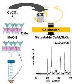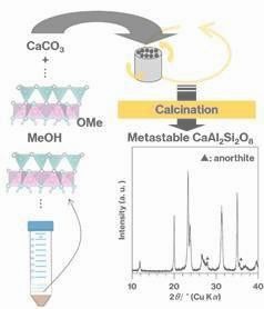 町田先生の研究成果で、不純物を除きさらに層が拡大したカオリナイトを炭酸カルシウムとの固相反応に用いることで、準安定CaAl2Si2O8結晶を反応時間が短くかつ副生成物を抑えて合成することに成功しました。