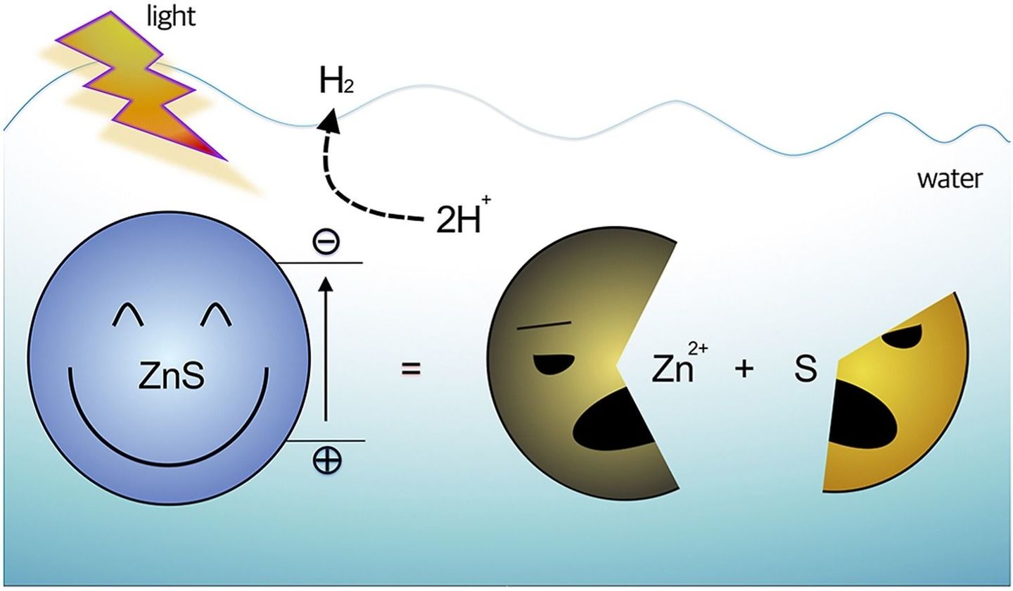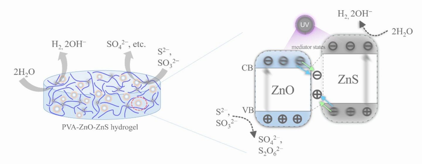 韓国のグループとの共同研究成果で、ポリビニルアルコール(PVA)ハイドロゲルに埋め込まれたZnO-ZnSヘテロ接合(ZnOS)をベースにした新しい光触媒複合材料を作製し、UV照射下においてNa2S/Na2SO3水溶液からH2を取り出すことに成功しました。