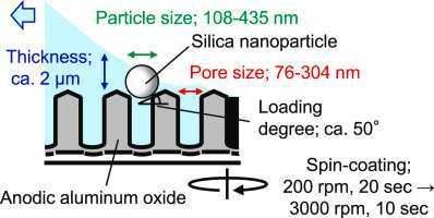 社会人博士課程の関口さん研究成果で、スピンコーティング法による陽極酸化アルミナ(AAO)基板上のナノ細孔上へのSiO2ナノ粒子の担持機構について分析した内容です。