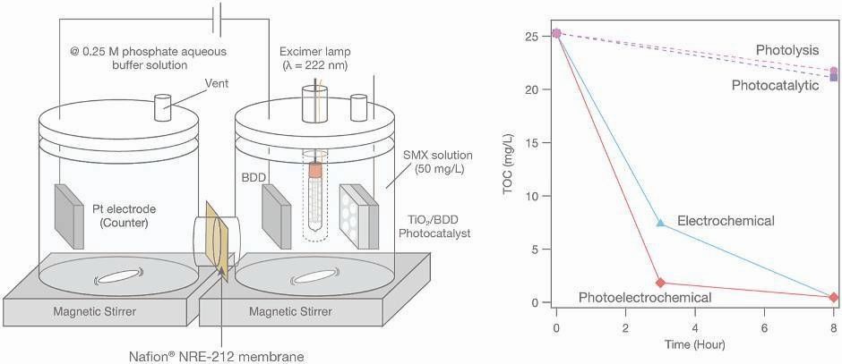 総合研究院の鈴木先生の研究成果で、光触媒、ボロンドープダイヤモンド電極および深紫外線を組み合わせた簡易浄水装置により、難分解性有機化合物であるスルファメトキサゾールの完全分解に成功しました。浄水処理工程における難分解性有機化合物除去に応用されることが期待されます。