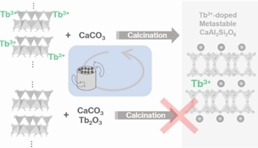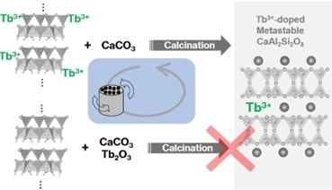 町田先生の研究成果で、Tb3+の準安定CaAl2Si2O8結晶へのドーピングに成功し、緑色蛍光体を作製した研究です。通常のカオリナイト、炭酸カルシウム、酸化テルビウムの固相反応では実現できなかった反応を、カオリナイトの端面にTb3+を吸着させてから行うことで、うまく進行させることができました。