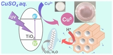 町田先生の研究成果で、加藤くん(2021年度学部卒)が実験を進捗させてくれました。銅イオンを含む硫酸酸性の溶液中にチタニア光触媒とシリカ―界面活性剤複合粒子を添加して光を照射することで、硫酸酸性化でチタニアの光触媒活性を発現させて、金属銅を析出することができました。早稲田大学物性計測センターの後藤隆弘博士にTEM-EDXを測定して頂き、共同研究とさせて頂きました。