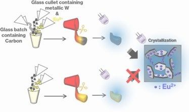 町田先生の研究成果で、ガラスの作製手法を巧く変えることによって、通常では共存しえないEu2+と金属W粒子をガラス中に存在させることができ、さらにEu2+の発光をガラスの結晶化に応答させることができた研究です。2021年度に修士を修了した江森くんの実験がベースとなっています。