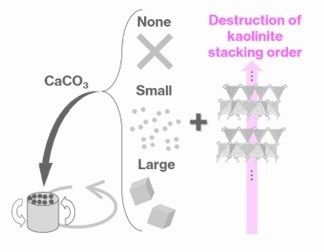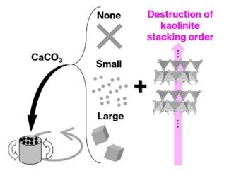 町田先生の研究成果で、カオリナイトと炭酸カルシウムの固相反応の前のボールミル処理において、弱い条件で処理することによって初めて炭酸カルシウムの粒径が処理後のカオリナイトの積層の規則性に影響を及ぼすことが明らかとされました。